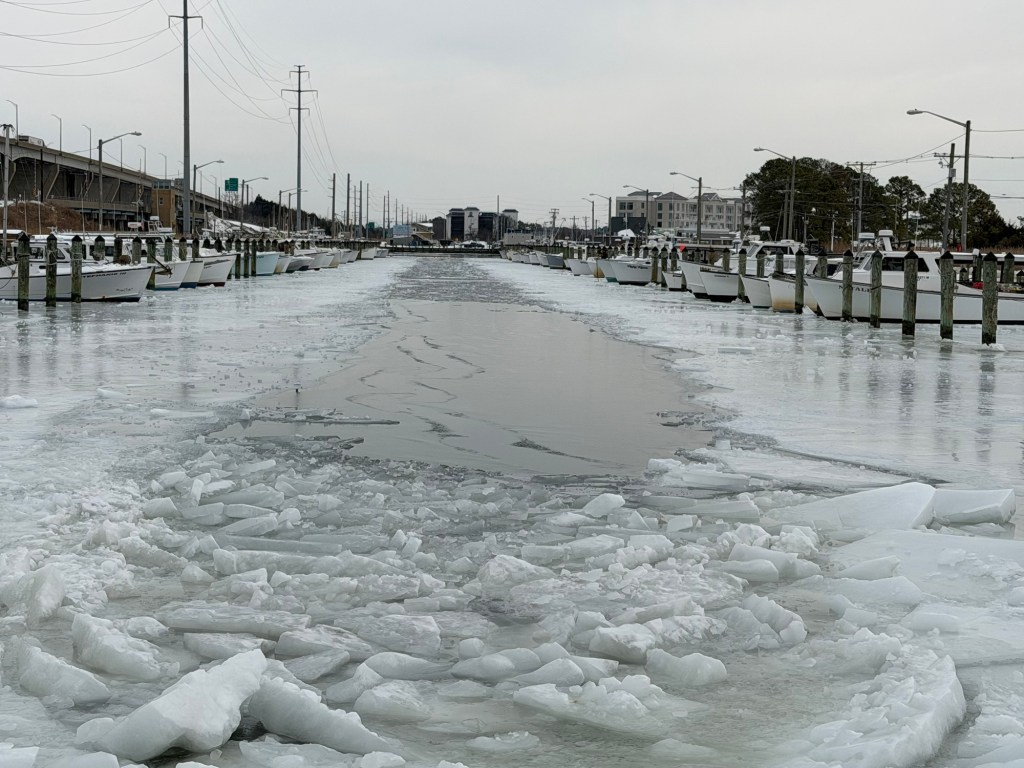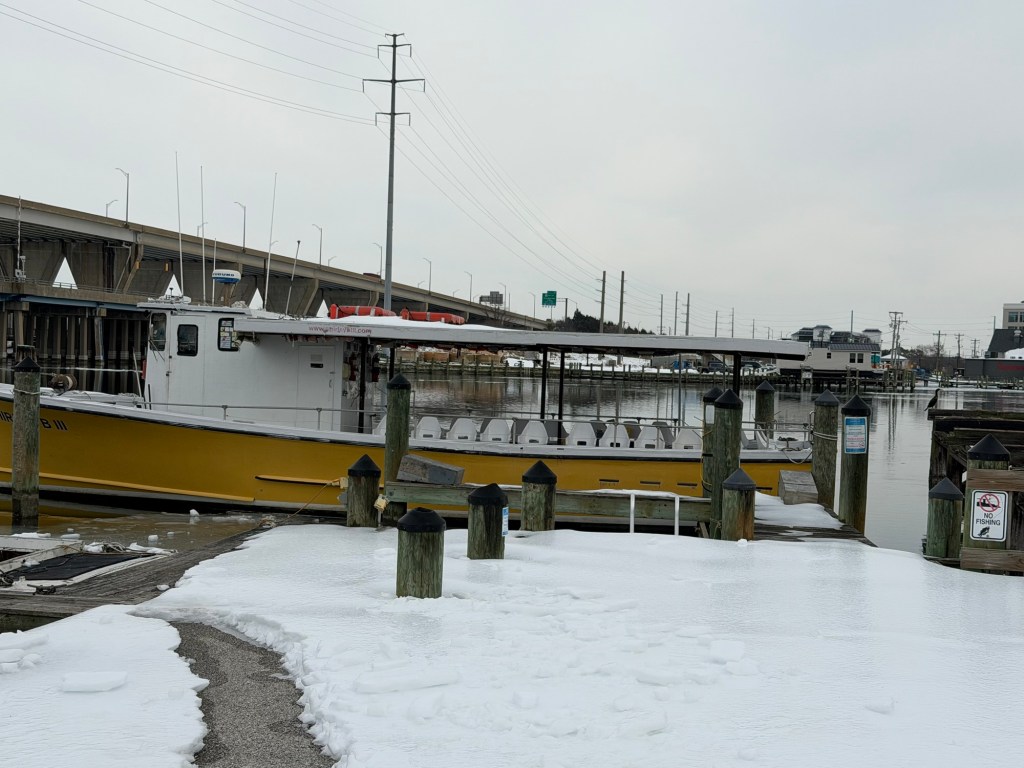 Finally it was not bitter old when we walked this afternoon and some of the ice and snow is melting . Had to run some errands and decided to go to watermen’s basin to check out the ice around the work boats