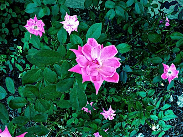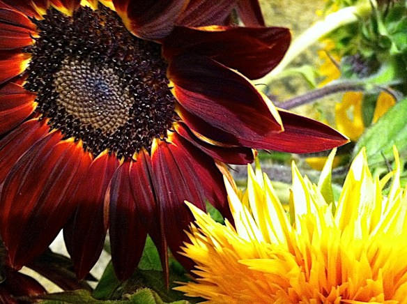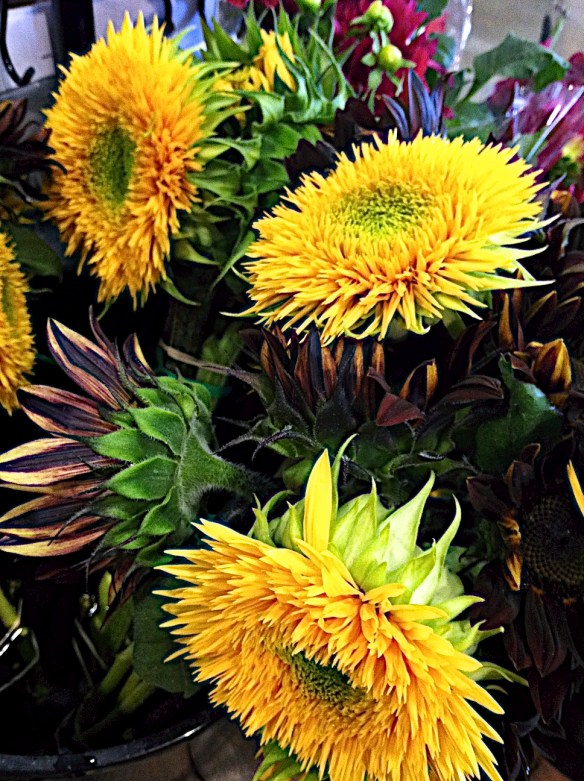 Weather forecast said 30% chance of rain and boy were they wrong. It’s been raining most of the day and we have several downpours. Just checked and it’s going to rain rest of day. We ended up having over 3 inches of rain. These flowers are part of a arrangement on my kitchen island – not sure what the dark colored one is – but really liked the colors.