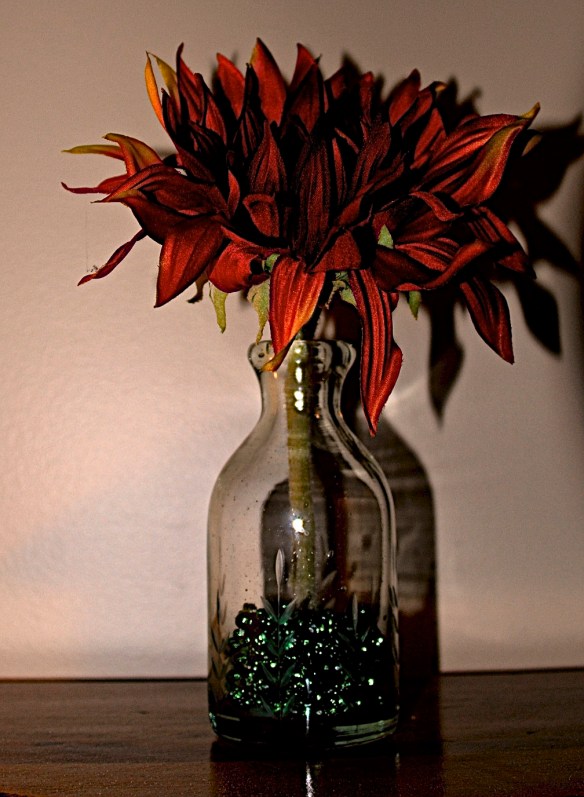 August 11, 2012 Posted on August 11, 2012 by lynmicphoto Reply Lyn and Michael’s Photos 2012 Bought a new vase and this flower for some color in our bathroom. Michael had the idea of putting the green beads in the bottom. Took this photo late last night and when I uploaded it liked the shadows.