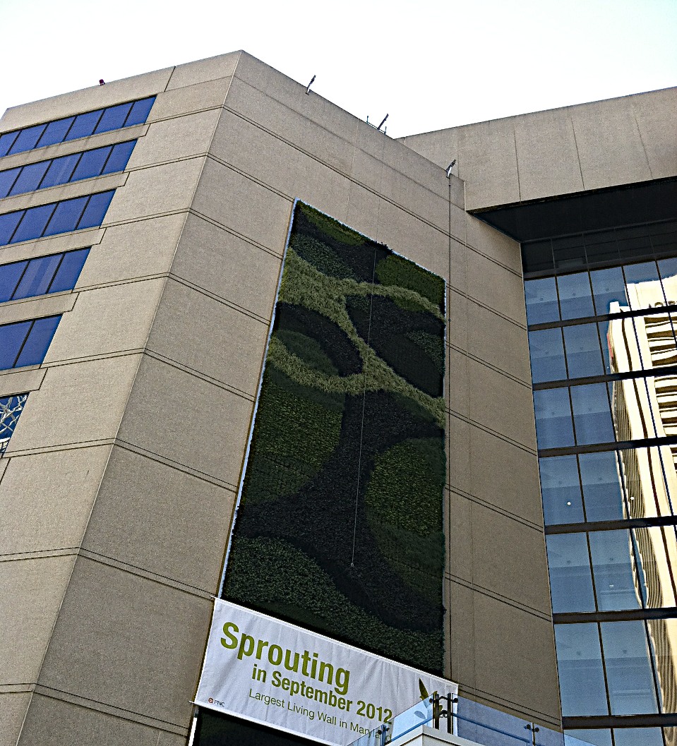 Went out to lunch today with my friends to celebrate my birthday. This building is right across the street from my building – in fact you can see the reflection of my building. The green is a living wall – made up of a variety of green plants. It’s supposed to be the largest living wall in Maryland. Have never seen or heard of anything like this.