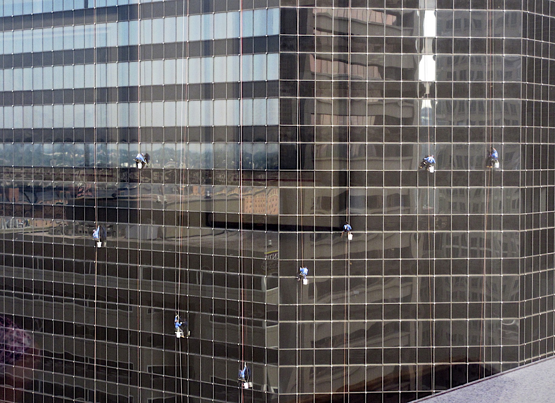 How would you like this job? Most people at work know I try to take a photo a day. They should – I have lots of photos all over my cubicle walls. One of my co-workers called me this morning and said I have your photo of the day you need to come into my office and hurry. So I grabbed my camera – was surprised to see 8 window washers on the building across the street. It was hard to take a good picture because of the angle and the reflections on the building. I have worked downtown for a number of years but have never seen that many window washers at once – usually it’s one or two. If you click on the picture it makes it bigger and you can see the window washers better