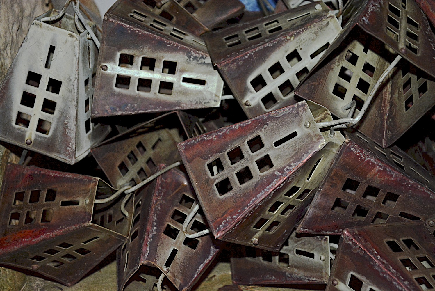 These rain bills used to hang on the porch on the side yard. I have a picture of the bells with ice and a picture of the bells with rain dripping down. When we were here 6 weeks ago i noticed they were missing from porch Tonight while I was walking around outside I noticed them in a pile on the ground, Will have to ask tomorrow what happened to them. Love all the different colors