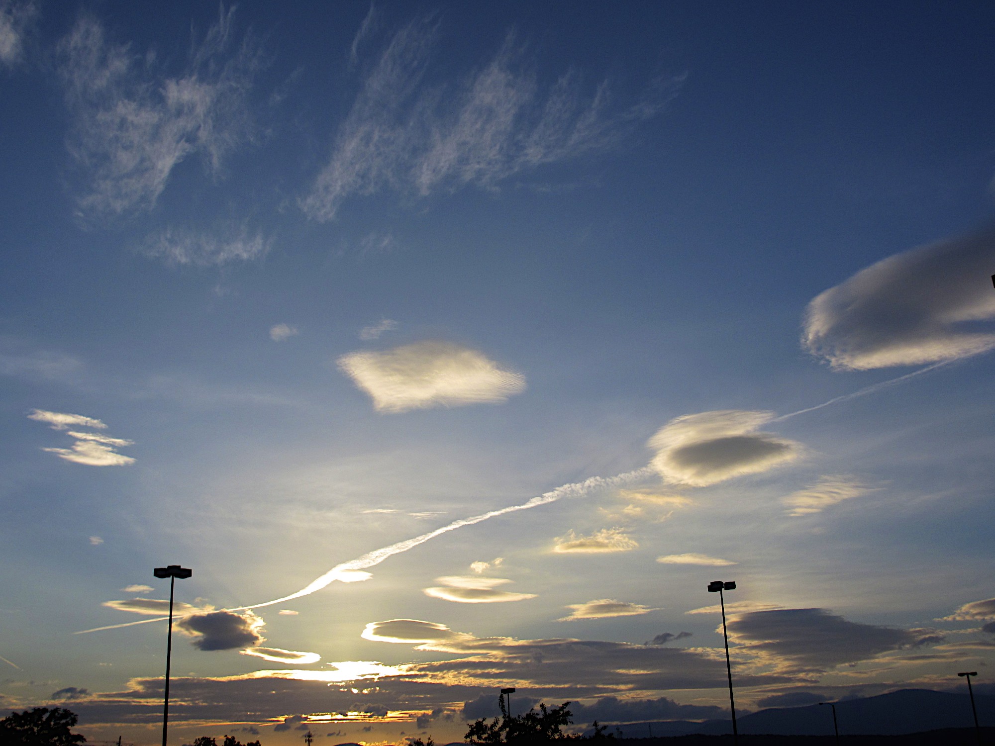 Michael and I decided since it was along weekend to head to Vermont.  He picked me up at work around noon.  Thought traffic would be heavy but we made good time so decided to stop in Goshen and see friends.  Had a great visit and then drove another hour to Kingston.  Stopped at the mall for a quick bite to eat and when we walked outside the sun was setting.  Sky was just beautiful.  It was hard to get a good shot with all of the lights in the parking lot.  I was disappointed that I could not get a good shot of the mountains.