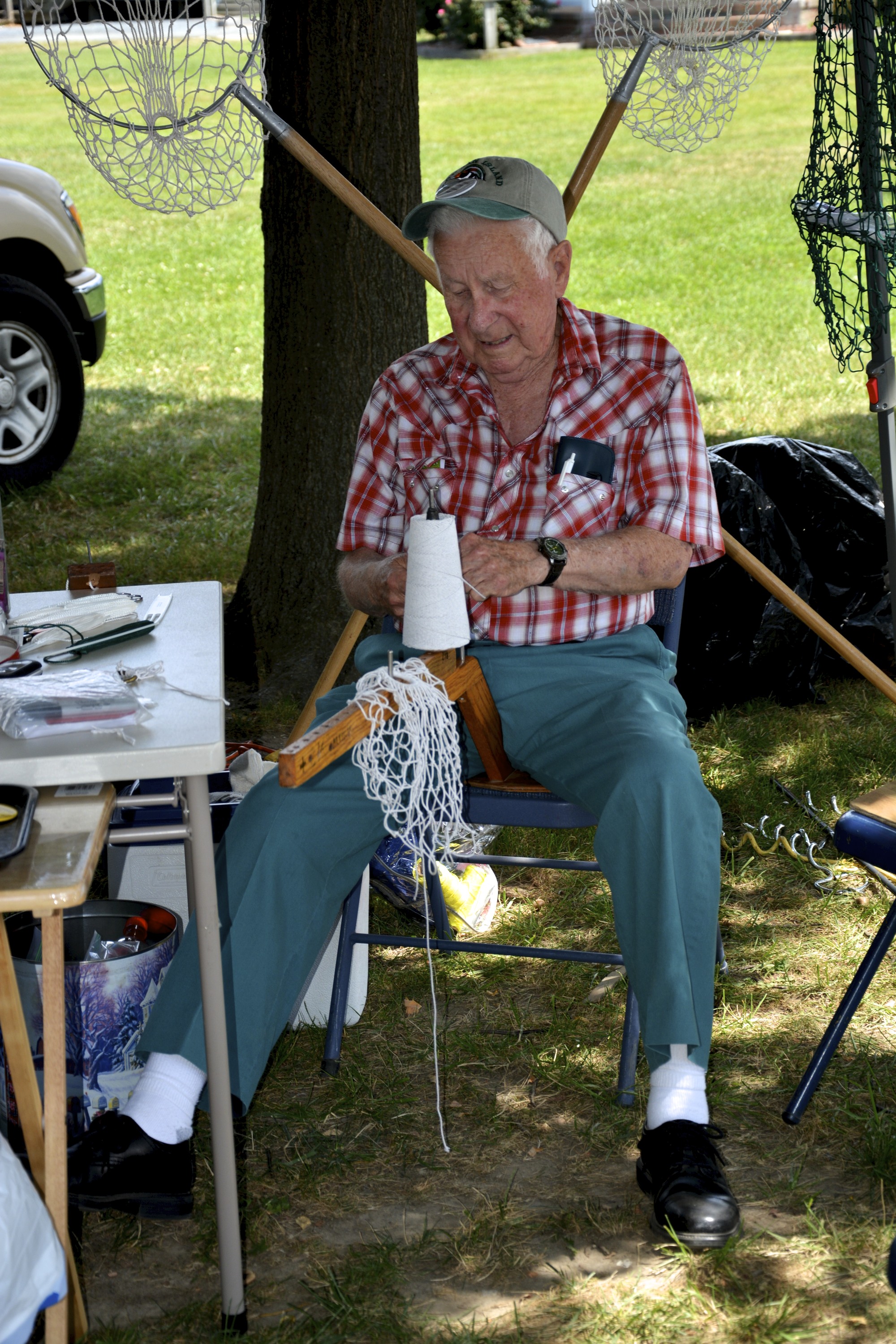 We bought some glass fishing balls in Japan many years ago. The balls are used for fishing floats. They came with some netting so you could hang them. We made a blue one into a hanging lamp and had it hanging in our living room window for a number of years. Now we have a red one and a blue one hanging from our deck. The nets are getting old and one finally broke about a month ago. We have been trying to find some new ones but didn’t have any luck. So when we got off the boat in St Michaels we noticed two men making some nets. This gentleman started making nets when he was 15 years old and he is now 85 years old. We told him what we were looking for and ended up buying a shopping bag made out of netting and another net. Then he told us that he had just gotten an email from someone asking if they could make a net for some glass fishing balls. It’s a small world. I promised to email him a picture of the ball in the net. He said if it didn’t work he could make one bigger or smaller.