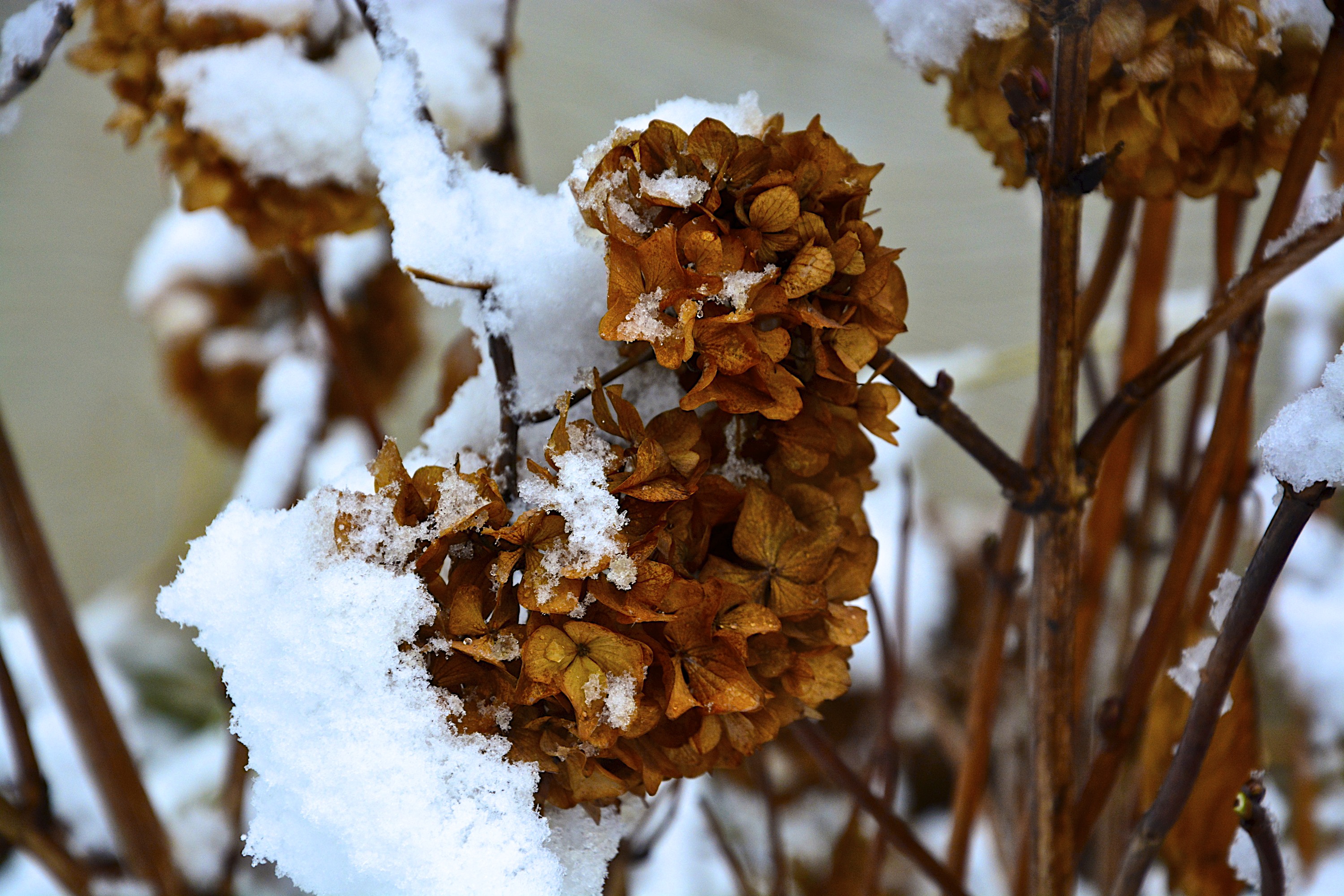 We had some more snow today – this time we got about two inches. For a while this morning it was like a winter wonderland. But by the afternoon the snow had melted from most of the trees and there was blue sky. Thank goodness I walked around the yard around noon and took a bunch of pictures