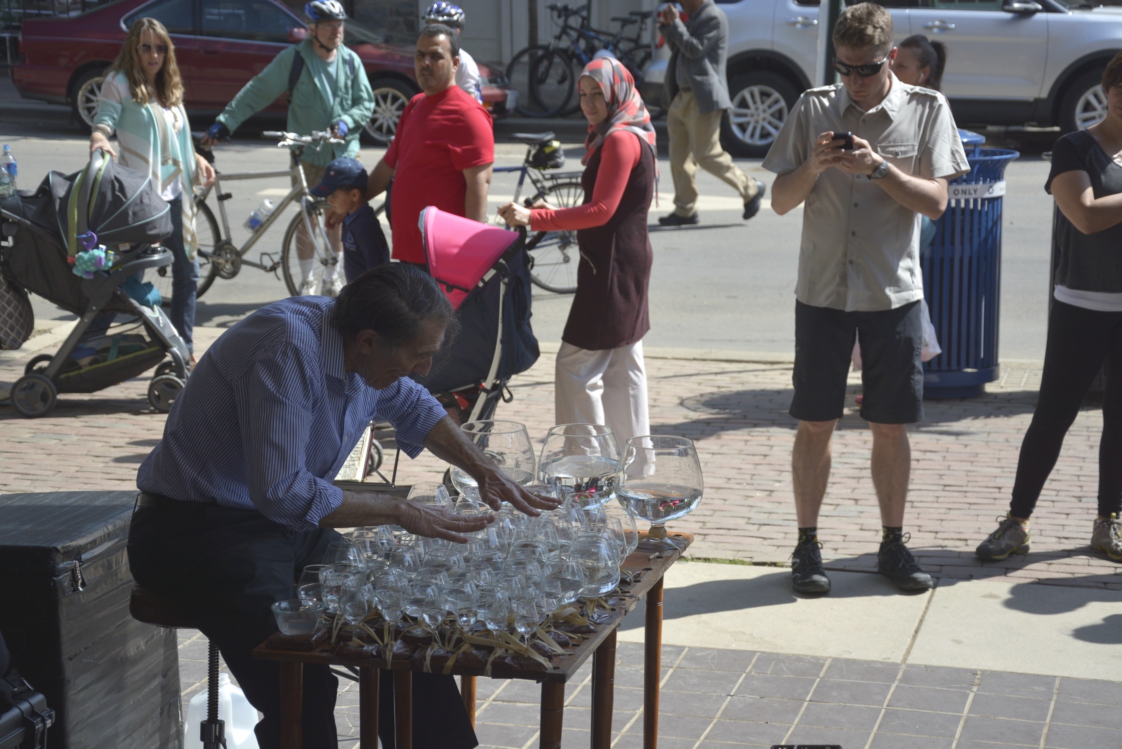 Beautiful day today. Blue skies and temperatures in the low 70s Michael surprised me and we went to Old Town Alexandria and took a boat trip on the Potomac. It lasted about two hours. Really enjoyed seeing the monuments from a different view point. On the way back to an early dinner we passed this street musician. Could not believe the music that came from water in these glasses.