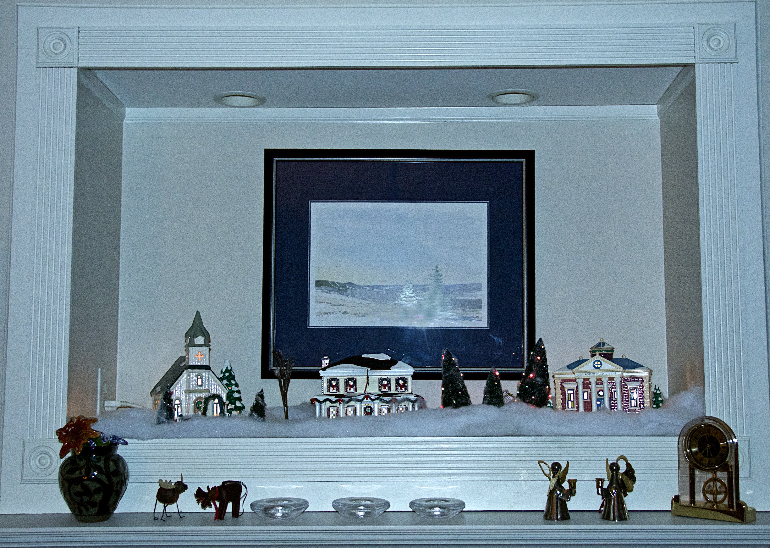 Lin and Michael's PhotosSome of my favorite things.  This little alcove is above our fireplace.  Three of my favorite Snow Village buildings are displayed above.  The church belonged to my mother in law and was our first piece in our collection  The middle piece is a bed and breakfast and Michael and I really enjoy staying at bed and breakfasts.  The piece on the right is a library and I love to read and usually go to the library once a week.  The painting is a snow scene of Timberline in Davis, West Virginia – it didn’t come out very well in this photo because of the glare from the flash.  We used to visit West Virginia a lot and it reminds us of all the good times we had.  Also it’s a snow scene – snow is in the forecast for tomorrow morning – but only an inch or two.  Really hoping for some snow