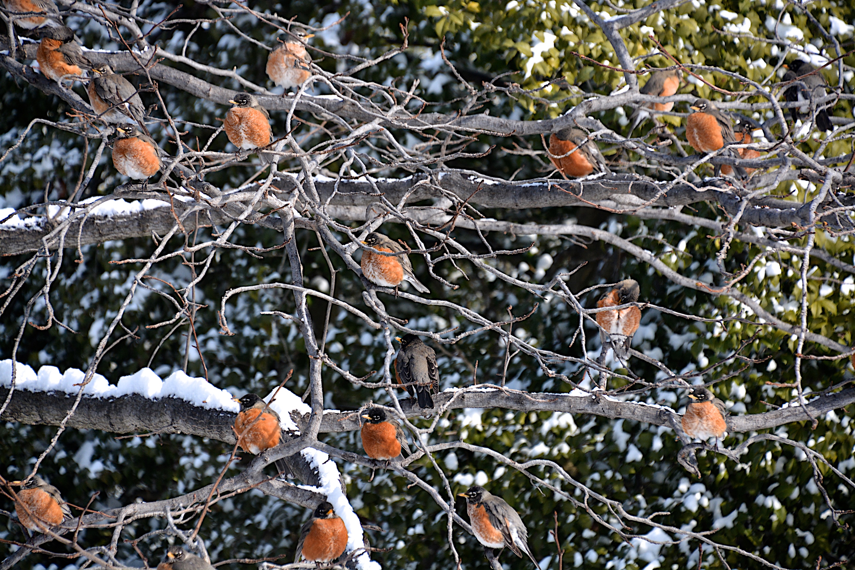 Posted on February 17, 2015 by lynmicphoto Reply Lin and Michael’s Photo Was surprised to see this many robins in a tree in the backyard