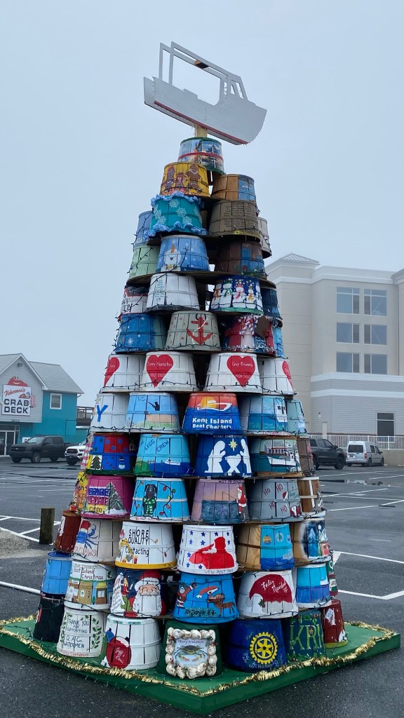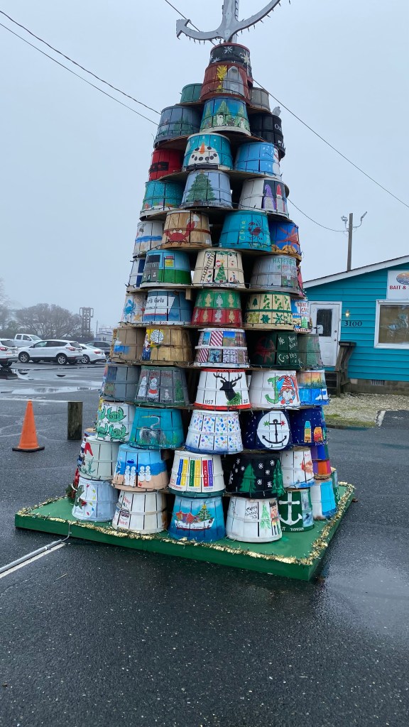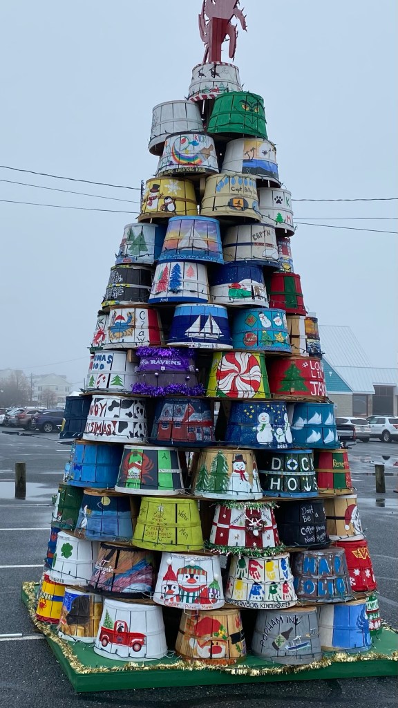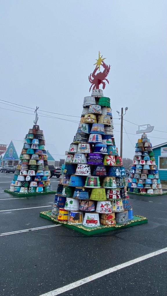 Stopped by to see the watermen’s association Crab basket trees. The first tree in 2020 had one tree with 202 baskets. Last year there were 2 trees. This year there are 3 trees. Each year the watermen’s association honours those watermen, past and active, and those who have passed away with six baskets painted with a red heart for each of them.