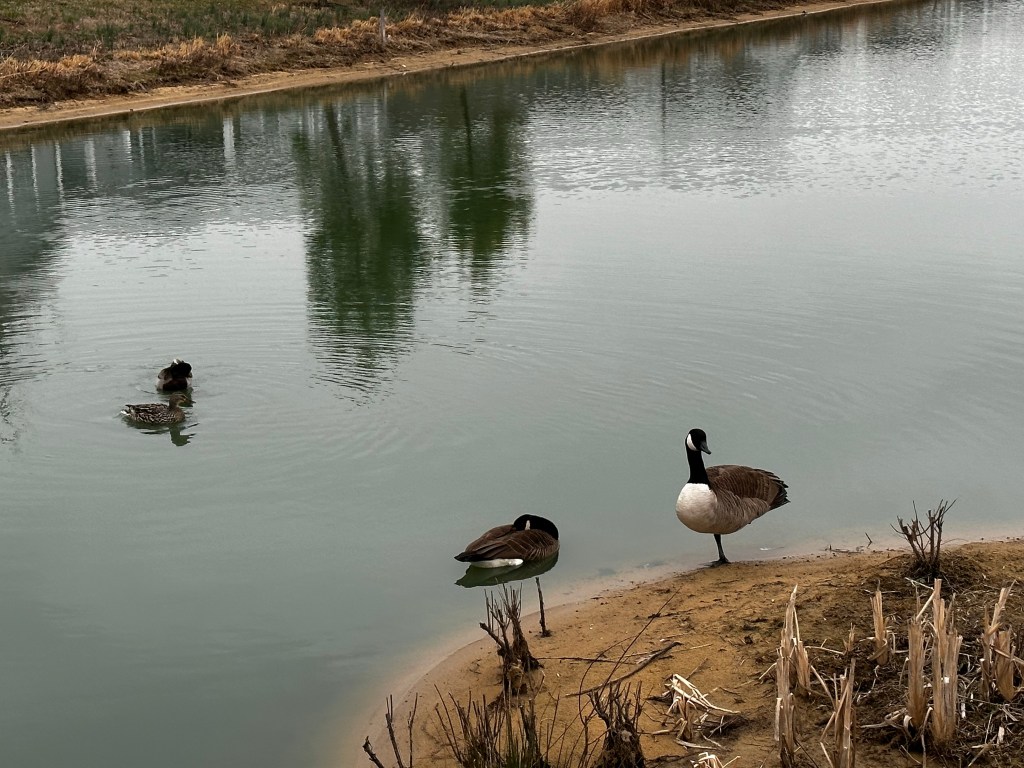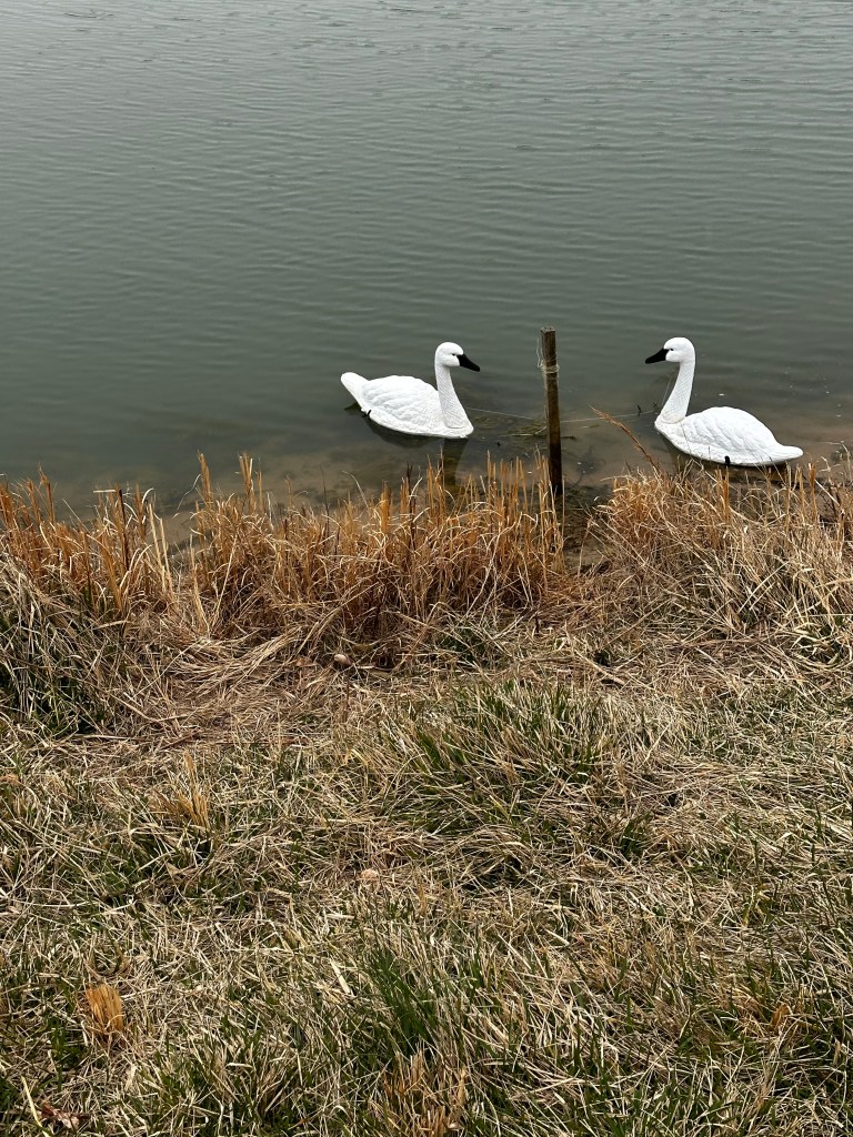 Very windy day. The wind right now is 20 mph. I just came across the bridge and there were wind restrictions since gusts were over 40 mph. There were lots of whitecaps on the water not sure where the swan decoys are. They must be up on the bank again