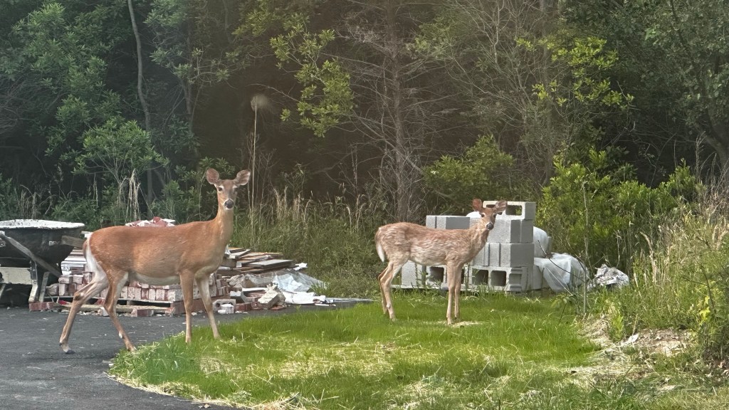 As I was leaving the library tonight one of my friends said look out the window. There were at least 6 deer. By the time I got my phone out several of the deer went into the woods but I get get a picture of two of them