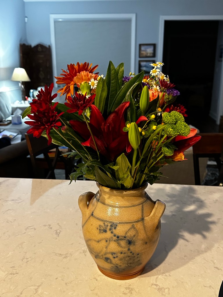 Busy day today and I didn’t have time for a picture. Knitting tonight at the library so I missed sunset. Decided to take a picture of some flowers I got at Trader Joes. Wish we had a Trader Joes closer