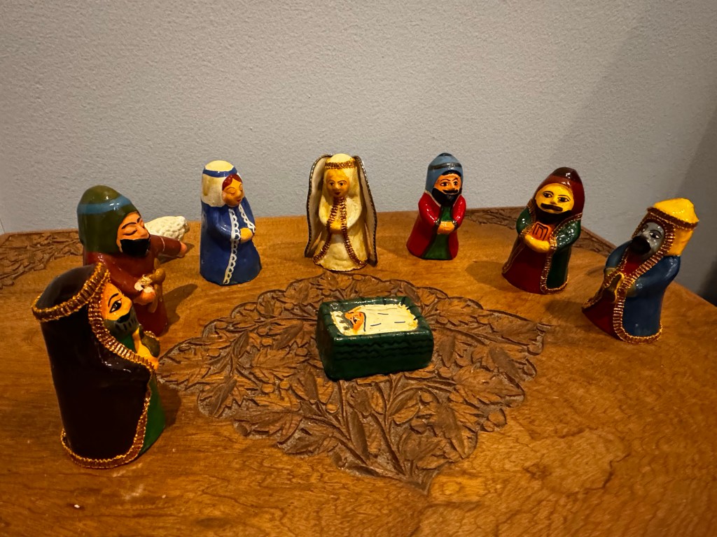 We bought this nativity scene in India many years ago it’s sitting on a wooden chest that was handmade in India. It was made to hold cassettes but now holds CDs
