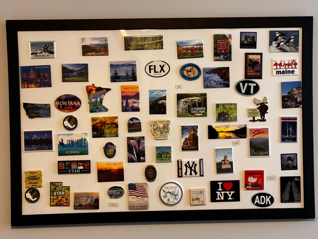 Rainy afternoon and evening. It’s after 11 and I just realized I never took a picture today. So I decided to take a picture of my white board. It is one of 3 that I have in the loft. We try to get a magnet from every place we visit