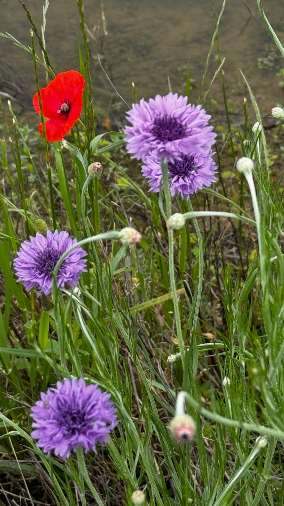 Rainy morning so we couldn’t walk. Took a short walk thus afternoon. Lots of pretty wild flowers along side the pond. Don’t remember seeing this many before