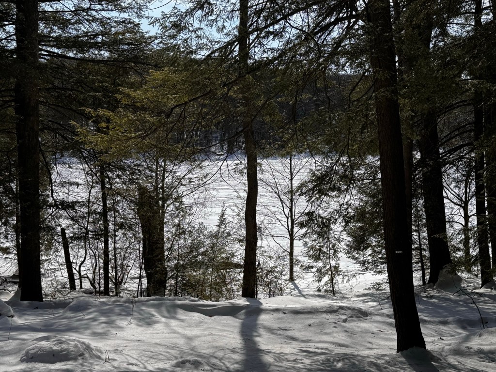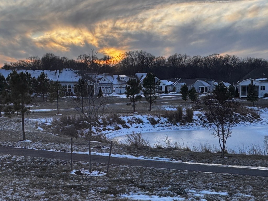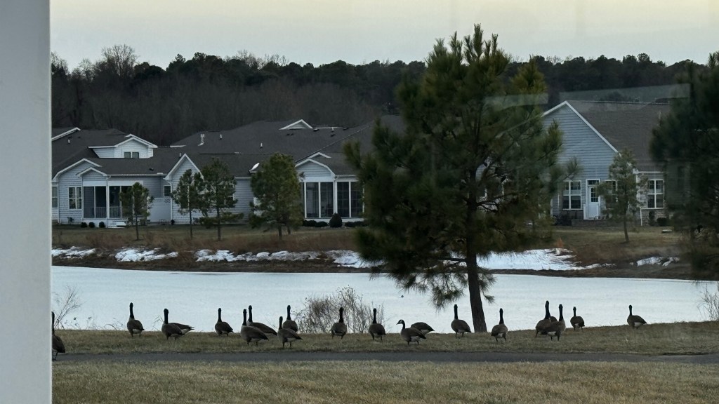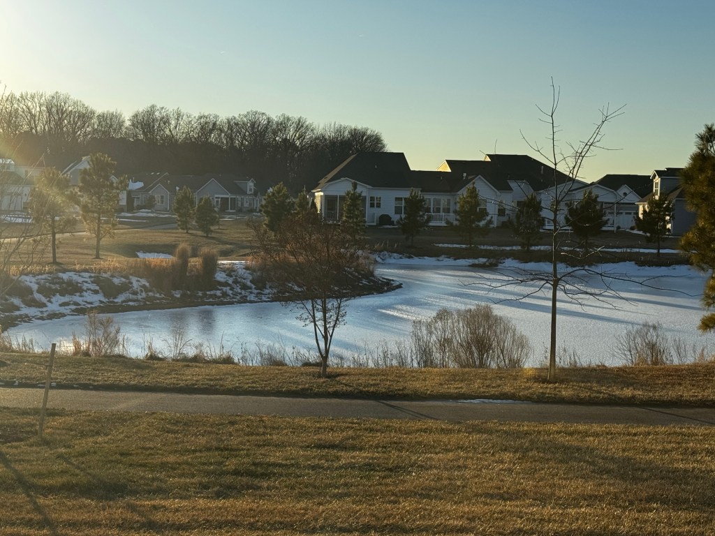 Rainy day. Most of the snow has melted and some of the ice on pond has also melted