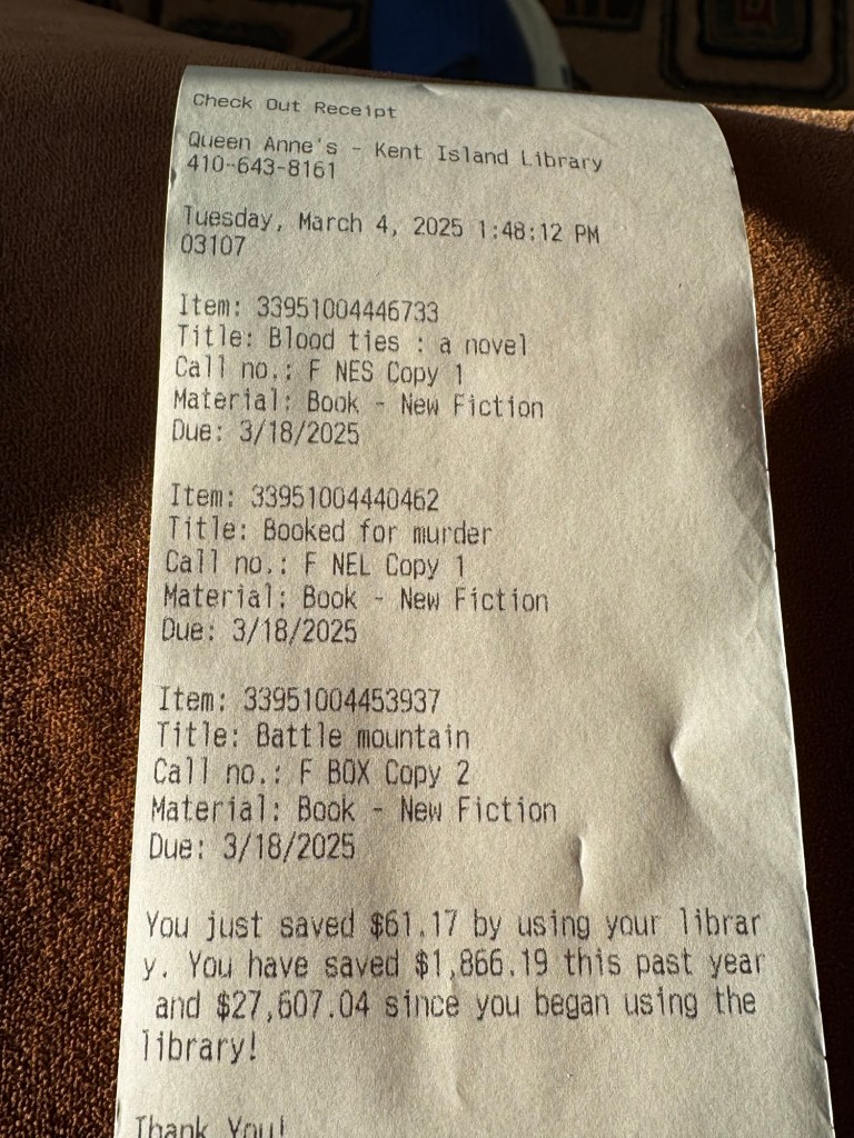 I am so lucky that we have a great local library. Just checked out the new C J Box book The check out receipt shows how much I have saved in 7 years