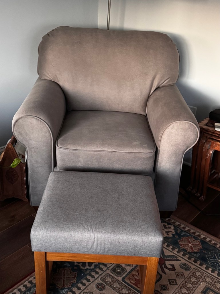 Finally got our new chair from sunroom. Only took 4 months. Foot stool from living room is same color so it worked out well