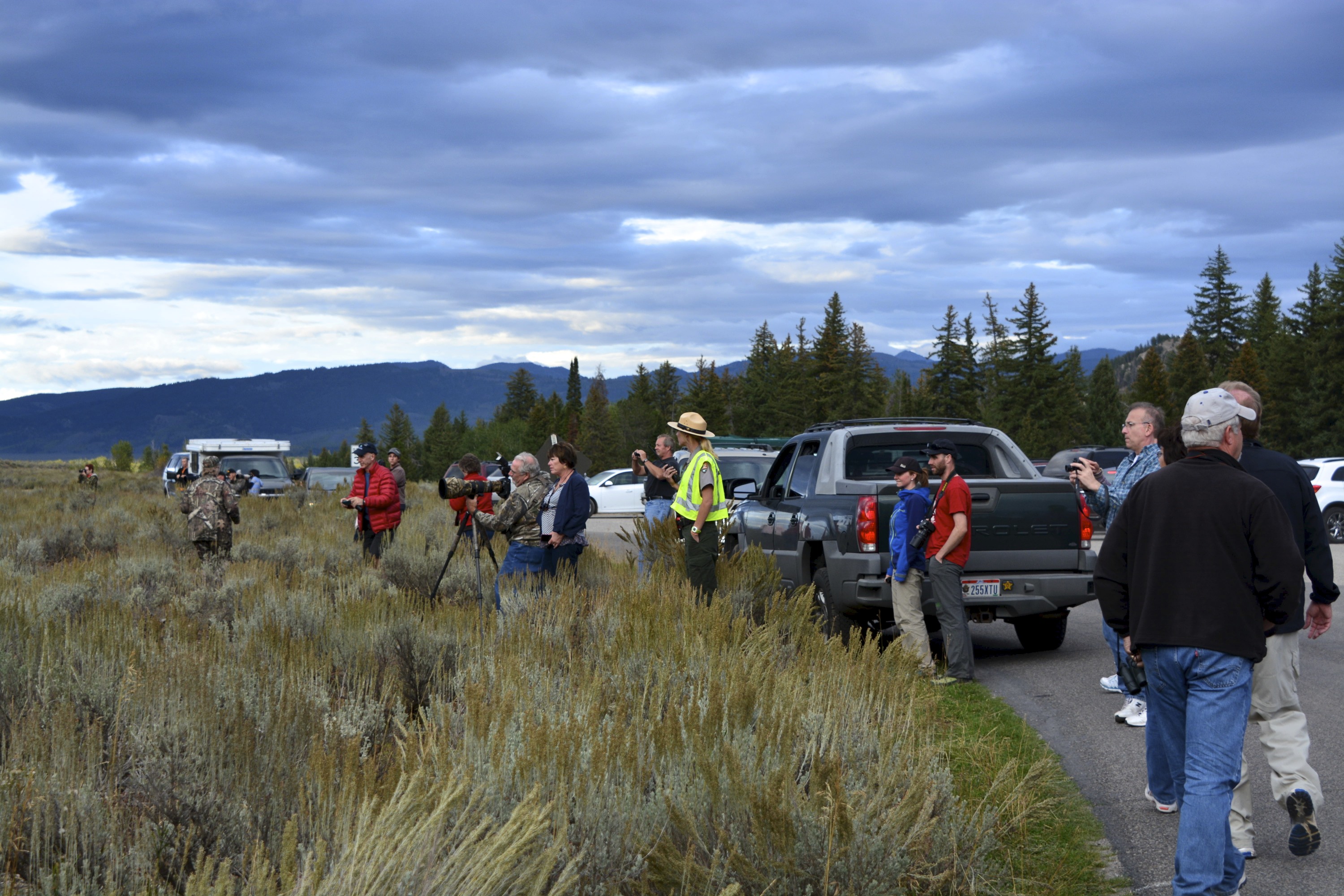 On our way back to the Wildflower Inn tonight, we saw a bunch of people and cars alongside the road. Has to be an animal in the woods. So of course we had to stop. The bear watch was on. There were 2 or 3 bears in the woods. The bears like huckleberries and we could see the huckleberry bushes move but could only get a glimpse of the bears from time to time. Two rangers showed up for crowd and traffic control. Here is a picture of a small part of the crowd waiting for the bears to move so we could get a photo.