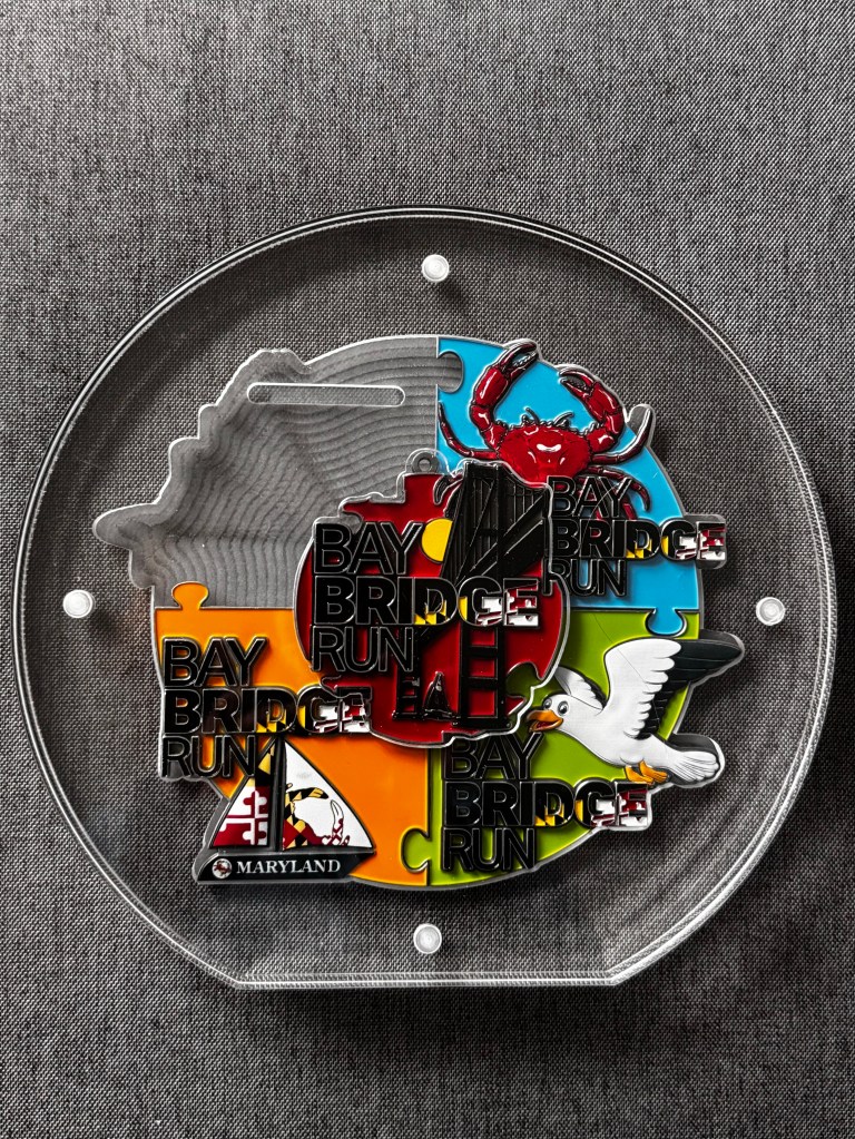 Even though they cancelled the Bay Bridge Run we still received our medal I did the race on the bridge three times and then walked on the Cross Island Trail with friends twice