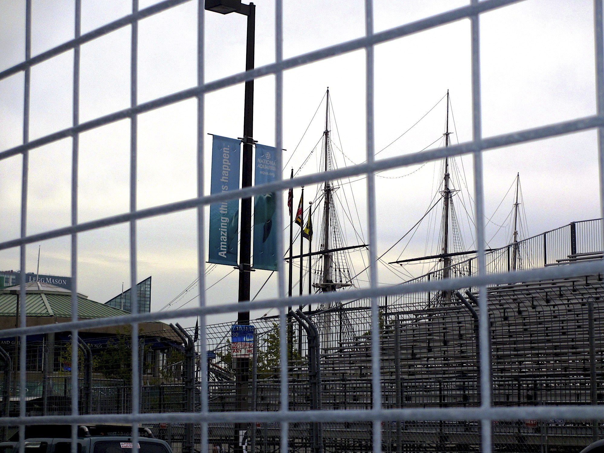 Posted on August 19, 2013 by lynmicphoto Reply Lin and Michael’s Photos There are bleachers on east side of Pratt Street by the Inner Harbor and fences on both sides of Pratt Street. The Constellation is in the background