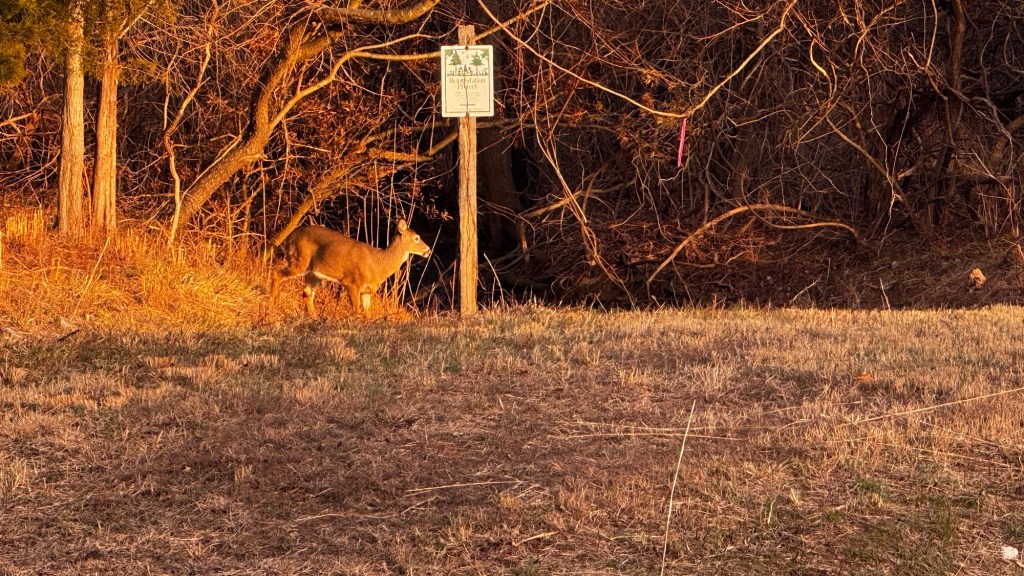 As I was leaving the library tonight one of my friends said look out the window. There were at least 6 deer. By the time I got my phone out several of the deer went into the woods but I get get a picture of two of them