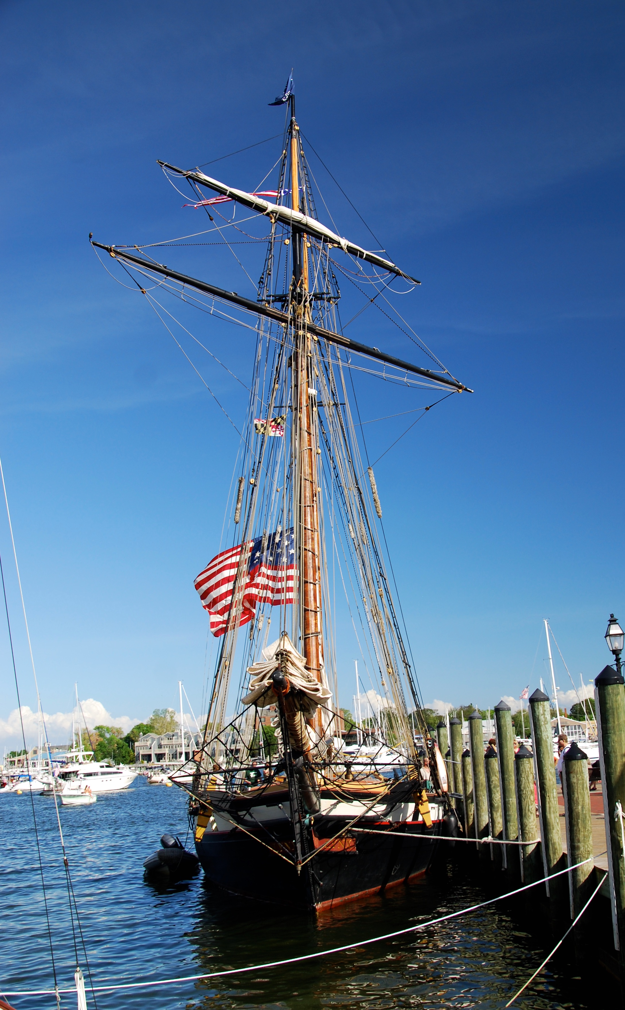 When we went over to Annapolis City Dock and we were lucky enough to see the Lynx. The Lynx is a square topsail schooner based in California. The Lynx is an interpretation of an American letter of marque vessel of the same name from 1812. It was hard to get a good shot since there were so many people there