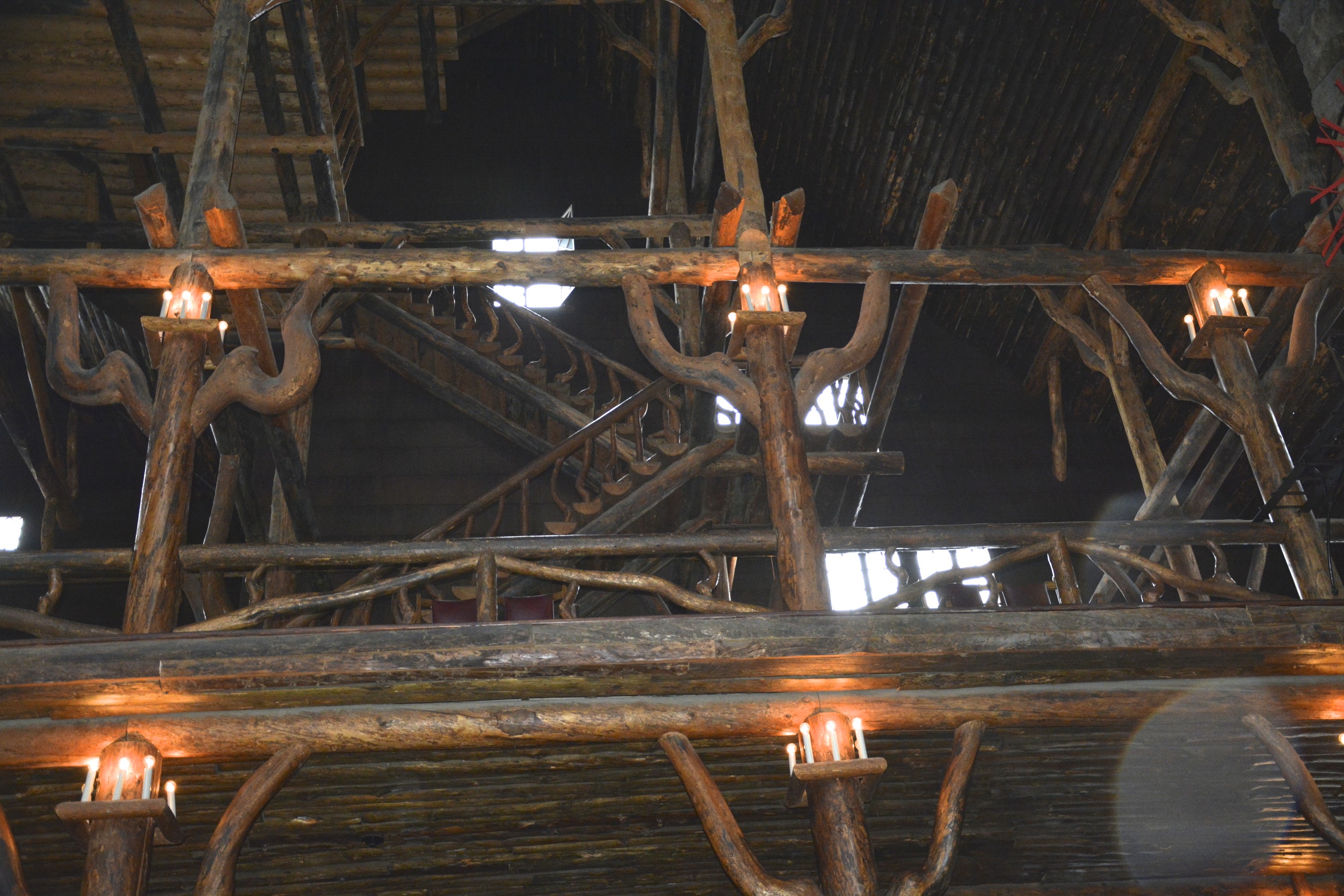 This is inside the lobby of the Old Faithful Inn. The Inn was built more than a century ago and is still one of the largest log structures in the world. The lobby towers more than 75 feet overhead and is dominated by a massive four-sided stone fireplace. It was hard to get a good shot since there were so many people walking around trying to get a good photo.