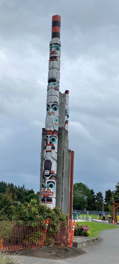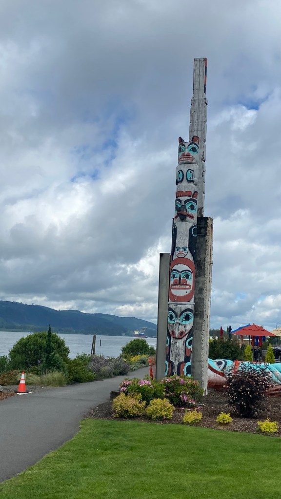 Some totem poles in Kalama. The biggest one is on the ground. Once I got back to our room, I had to do some research. There were four totem poles featuring mythical forms, symbols and creatures of the Pacific Northwest Native American Culture the tallest pole was carved from a 700 year old western red cedar and is 140 feet. According to local tourism it is the largest one piece totem in the world