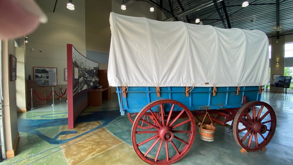 A sign in Center said that between 1843 and 1859, half a million people packed their belongings into a covered wagon like this one and made the 2,000 mile journey to Oregon Washington and California to claim the promise of land
