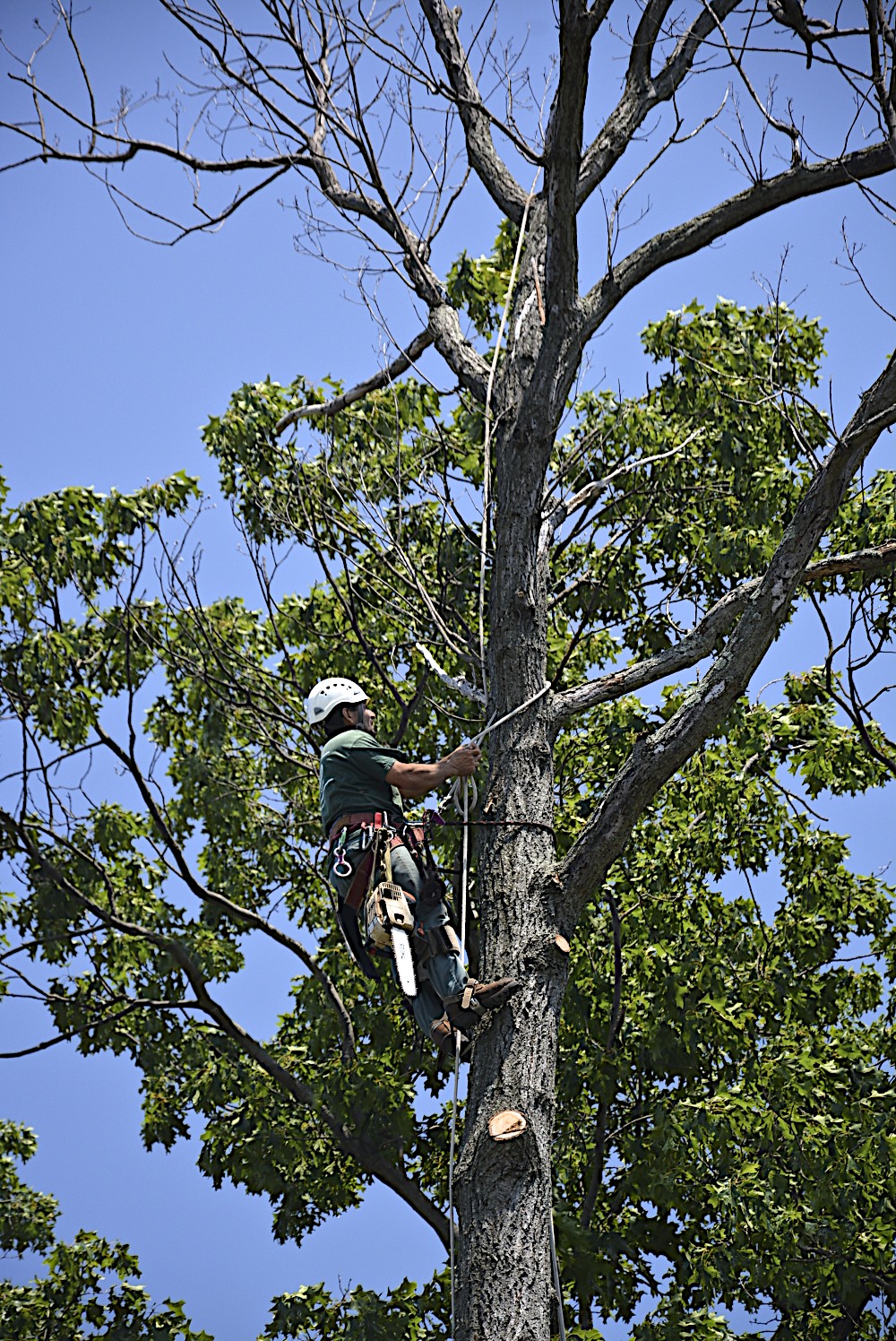 Our neighbor had to have a dead tree taken down today It was at least 70 feet tall and was between our houses. They used the same tree service that we did last month. This time I got to watch part of the process. I sure would not want that job.